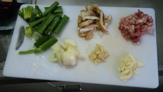長ネギの青い部分2本分、シイタケ4枚、中タマネギ半分、ショウガ半分、ニンニク2欠片
